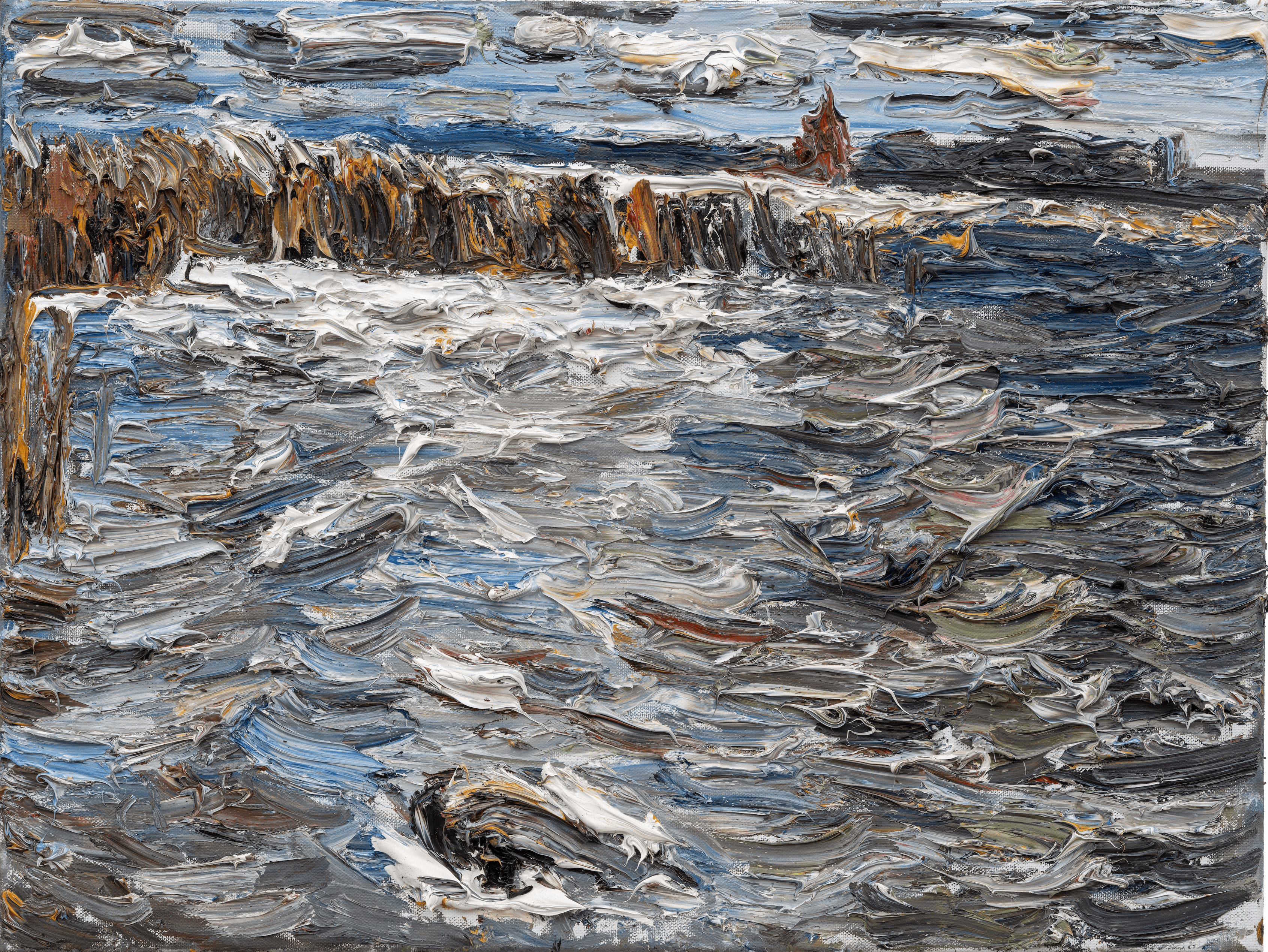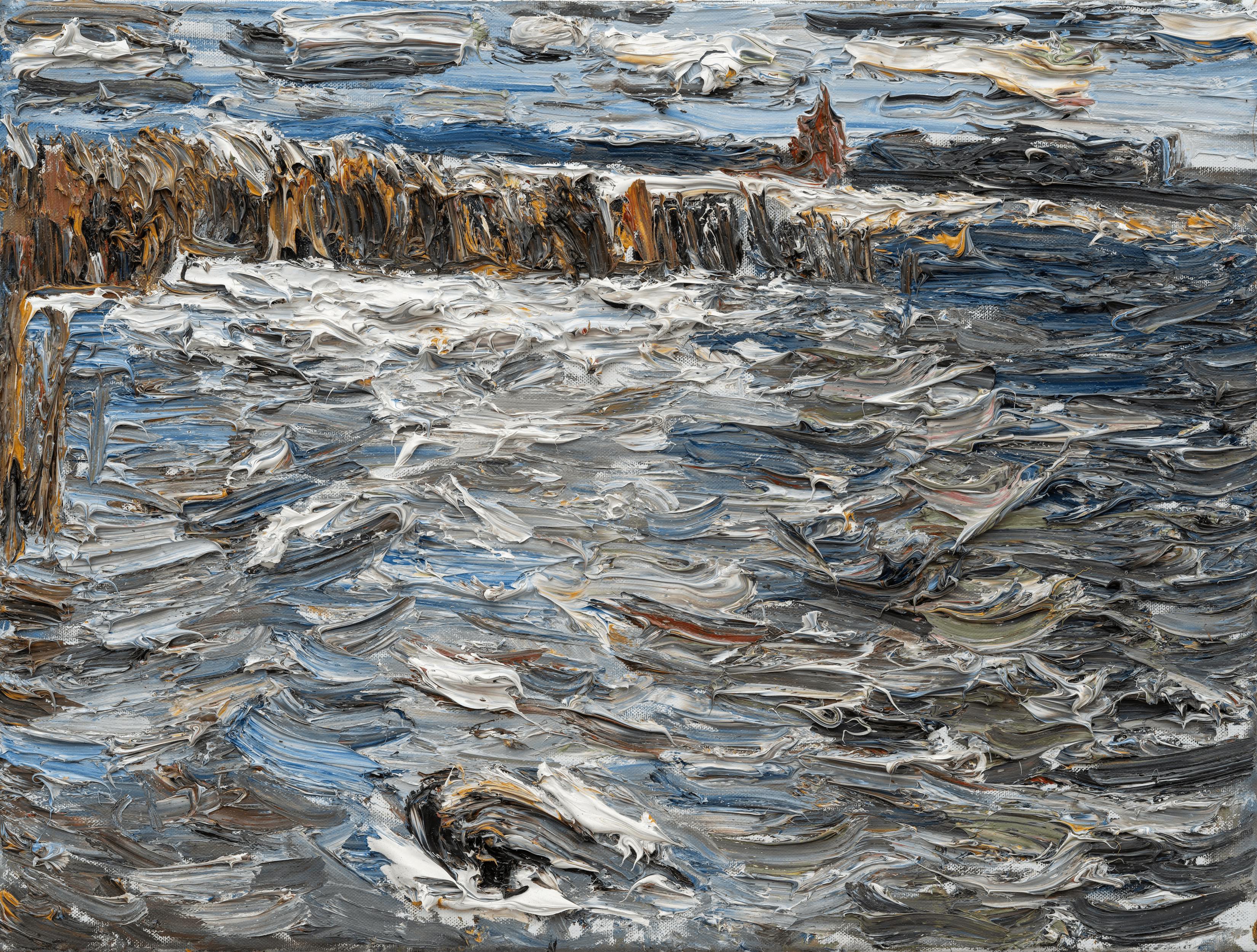 In der Ausstellung „zwei Lichttemperamente“ treffen eine Künstlerin und ein Künstler, Sonja Weber und Christopher Lehmpfuhl, aufeinander, die sich beide seit Jahrzehnten kennen und schätzen und mit dem Licht auseinandersetzen. Allerdings auf sehr unterschiedliche Weise. Während Sonja Weber ihre Bilder webt und eigene Fotografien als Vorlage verwendet, malt Christopher Lehmpfuhl vor Ort mit den Händen und viel Ölfarbe. Seine Bilder erzielen geradezu eine dreidimensionale Wirkung. Bei naher Betrachtung wirken sie abstrakt und konkretisieren sich zu einer Landschaftsformation oder Architekturansicht mit dem nötigen Abstand. Bei Sonja Weber überzeugen der abstrakte Ausschnitt, die Lichtreflexe auf dem Wasser, die Strukturen und Form der Wellen, welche sehr spannend komponiert sind. Auch hier spielt sie mit der abstrakten Wirkung der Nah- und Fernsicht.