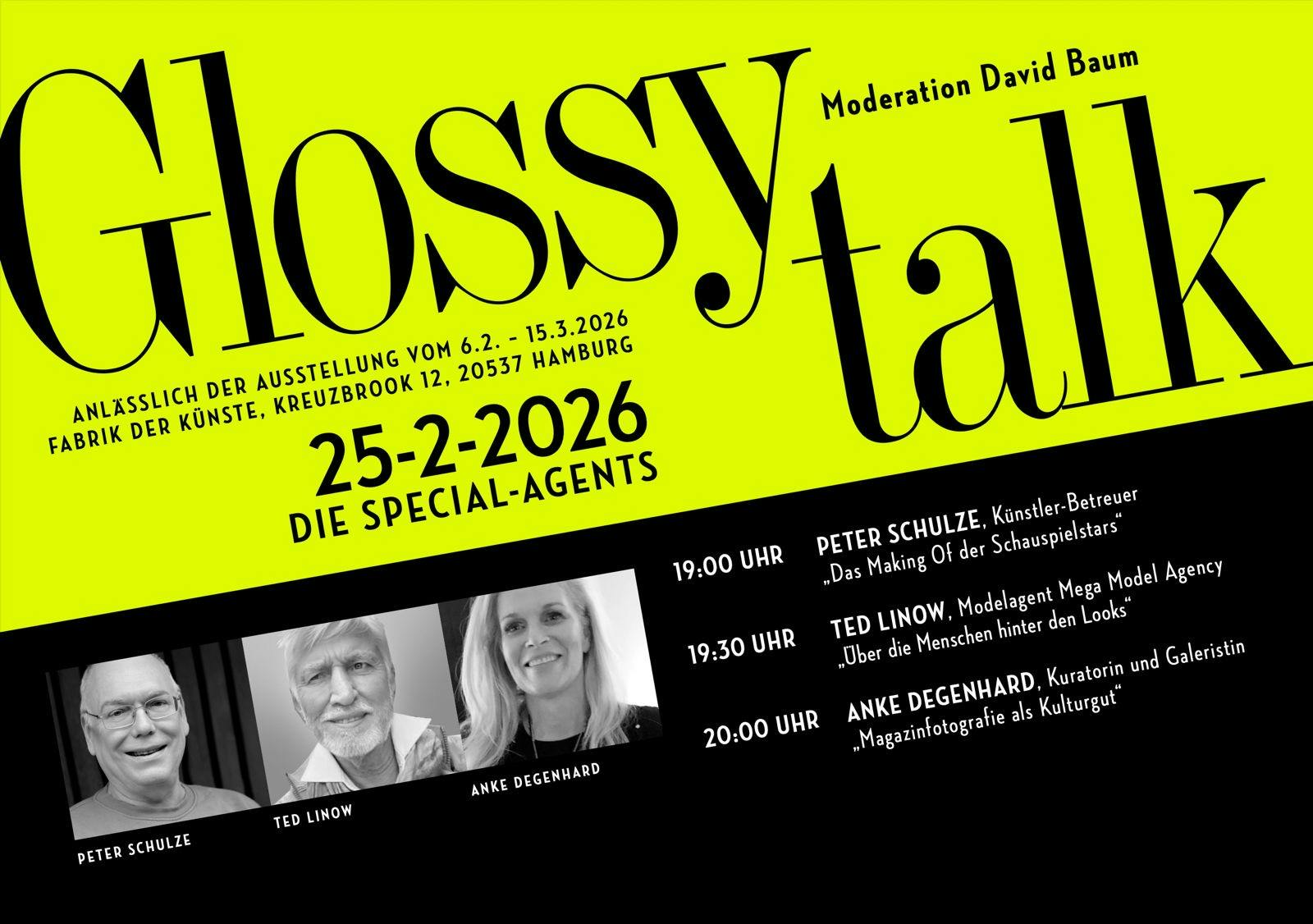 Der Magazinjournalist David Baum hat für das Ausstellungsprojekt „GLOSSY“ seine persönlichen Favoriten aus drei Jahrzehnten kuratiert und liefert zu jedem Motiv eine Hintergrundgeschichte oder Anekdote. Ab 5. Februar 2026 zeigen wir Ihnen die Werke von Fotografen und Fotografinnen, die Deutschlands Magazinkultur prägten, darunter u.a. Esther Haase, André Rival, Bryan Adams, Hubertus von Hohenlohe, Frank Zauritz, Jana Mai, Mathias Bothor, Robert Brembeck, Dirk Bruniecki, Laurent Burst, Simon Lohmeyer, Oliver Mark, Bernd Possardt, Peter Rigaud, Götz Schwan, Bodo Vitus, Christoph Voy, Markus Burke, Paul Schirnhofer, Cecil Arp – sowie Jan Riephoff, der auch als Co-Kurator der Ausstellung beteiligt war. Im Rahmenprogramm kommen in Podiumsgesprächen Chefredakteure, Artdirektorinnen, Fotografen und Magazinmacher zu Wort und erzählen aus ihrem Schaffen.